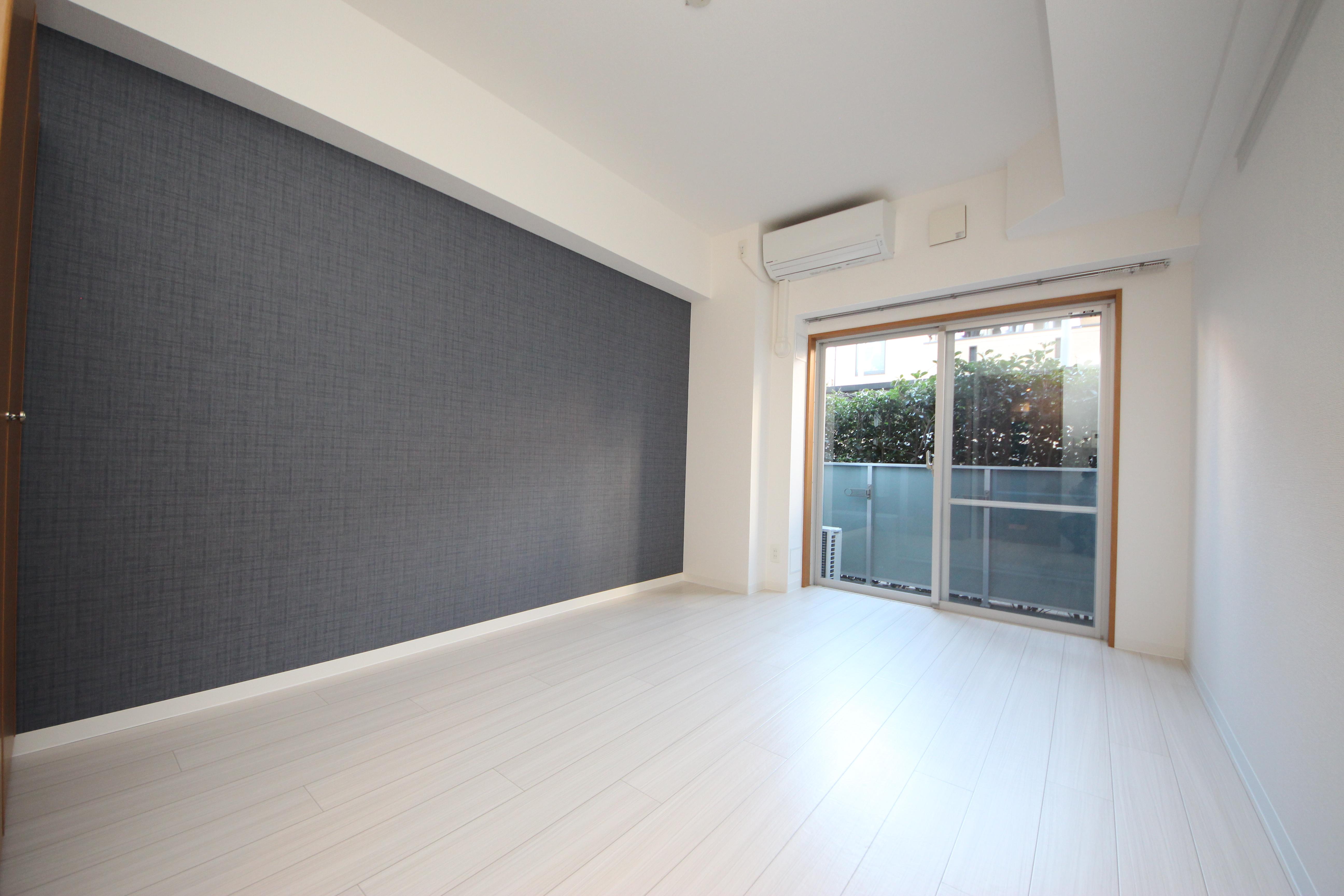 【床は明るい色に張り替え、紺色のアクセントクロスを導入】