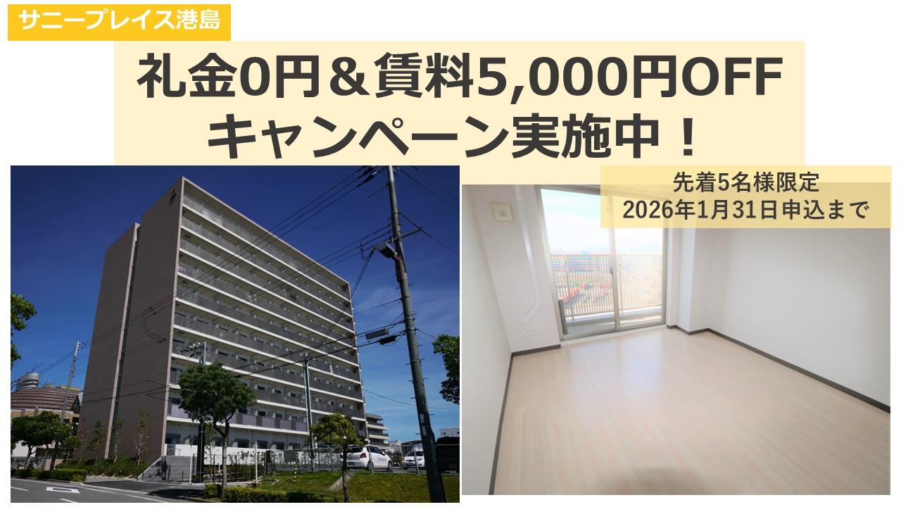 2026年1月31日までに【サニープレイス港島】にお申込の方限定で礼金オフ&賃料5,000円オフキャンペーン実施中。