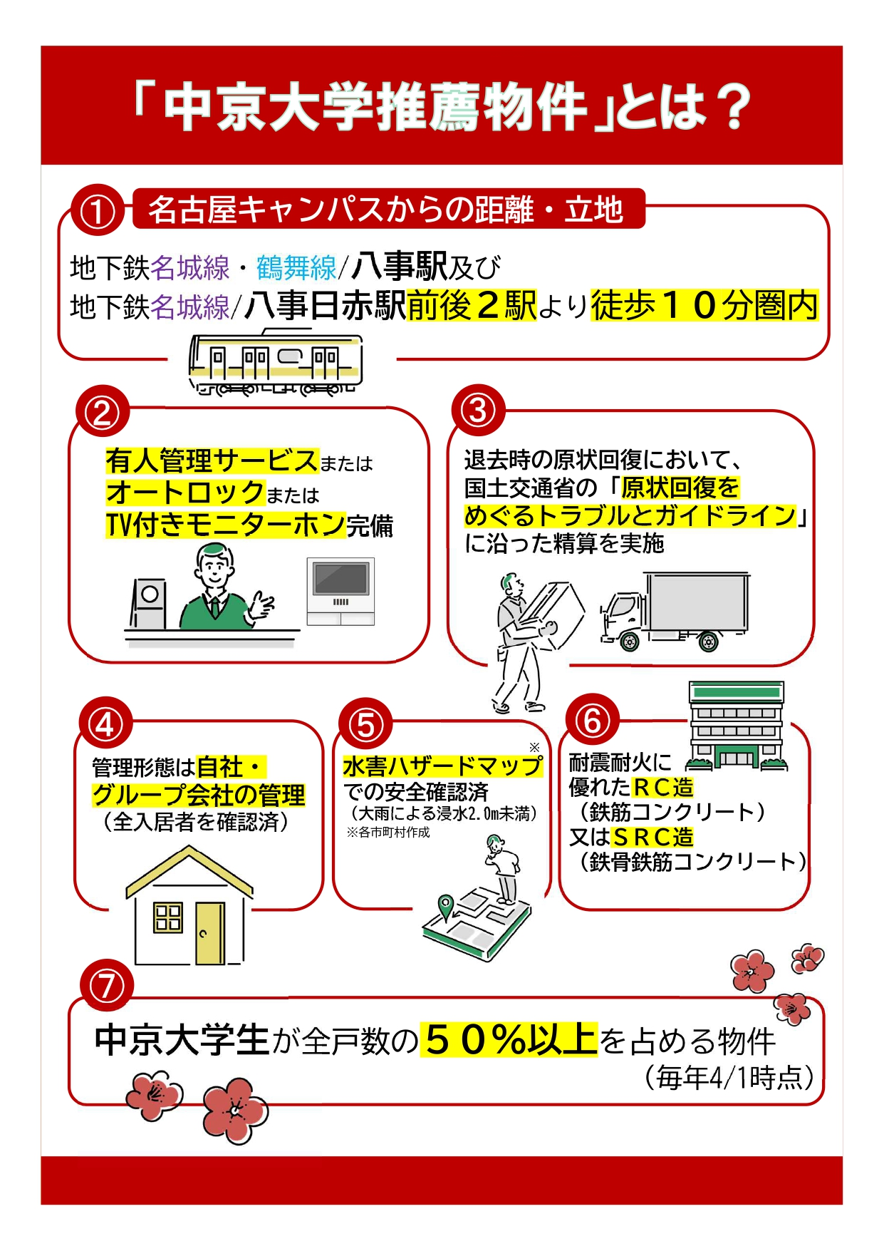 中京大学サービス株式会社(梅村学園100%出資)と提携しているナジックでは、立地・セキュリティ・賃料など一人暮らしに最適なマンションとして選ばれた「中京大学推薦マンション」を紹介しています。