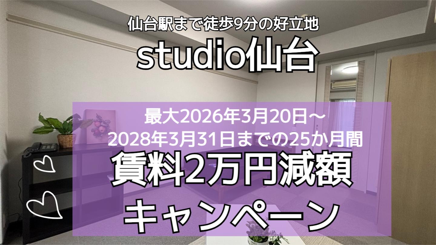 仙台駅まで徒歩9分の好立地【studio仙台】にて、東北大学・東北学院大学の学生限定2年間賃料2万円減額キャンペーンを行います。