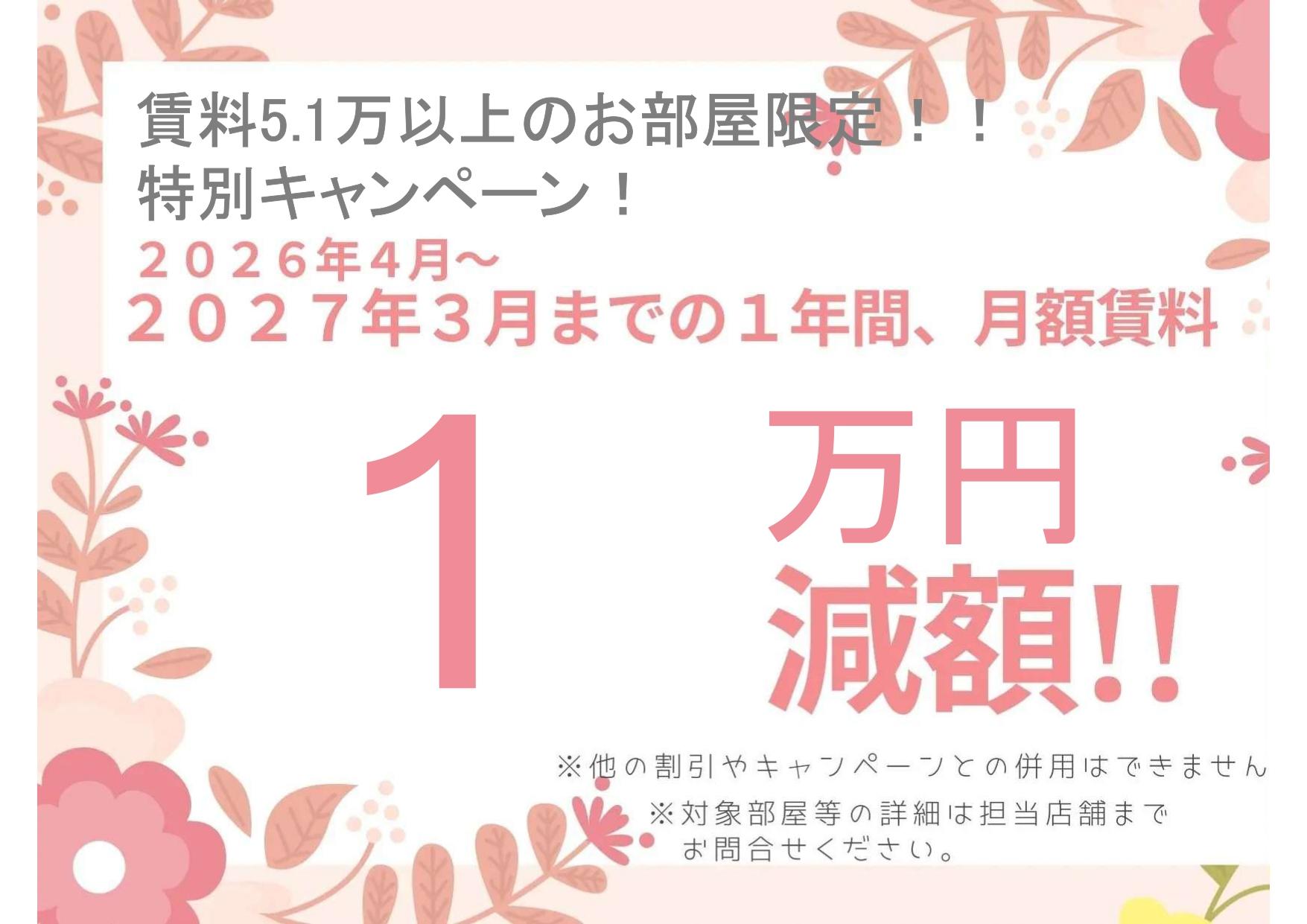 賃料5.1万以上のお部屋に限り月額10,000円の賃料割引キャンペーン(当社HP限定)を実施いたします。