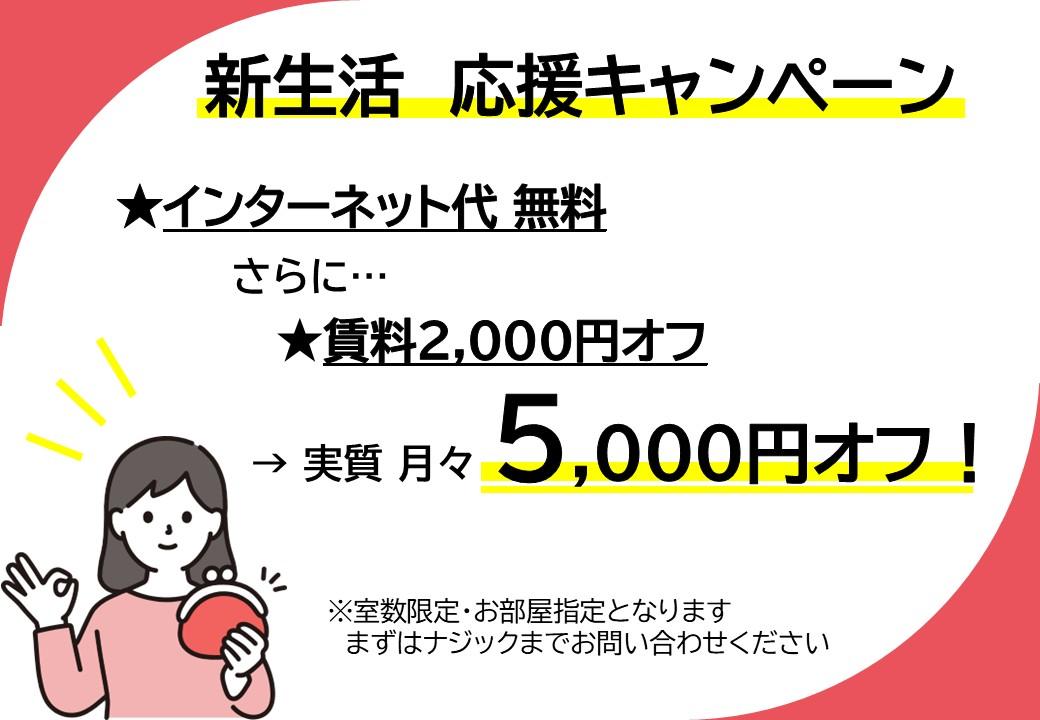 インターネット無料に加え、ご紹介中の賃料から入居期間中ずっと2,000円オフとなるキャンペーンも実施。