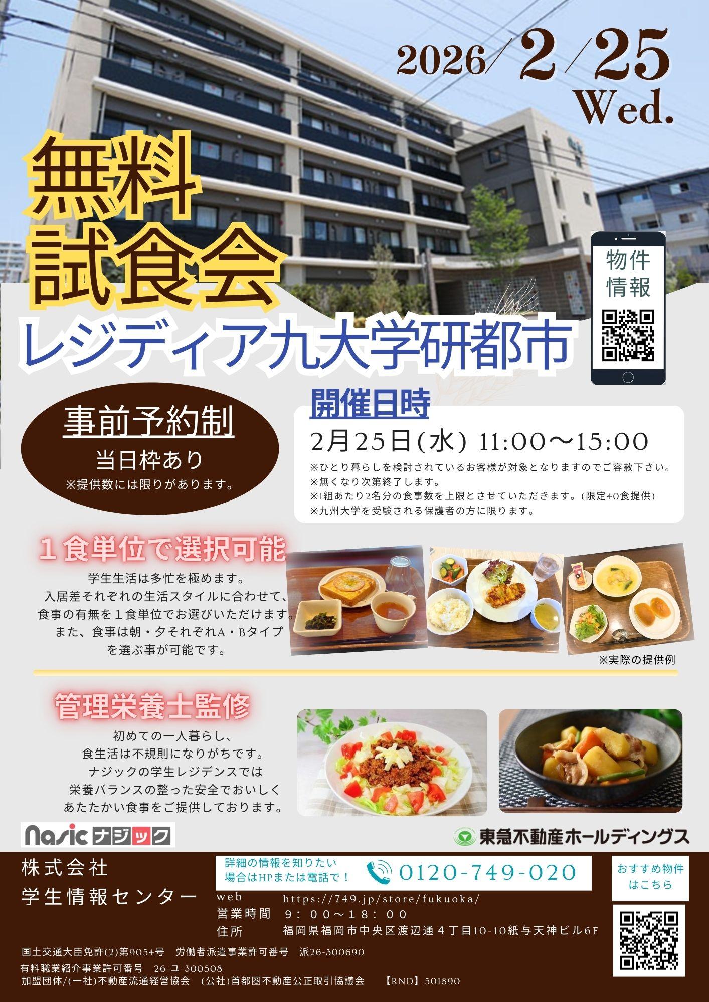 食事付き学生マンション『レジディア九大学研都市』にて無料試食会を実施します。