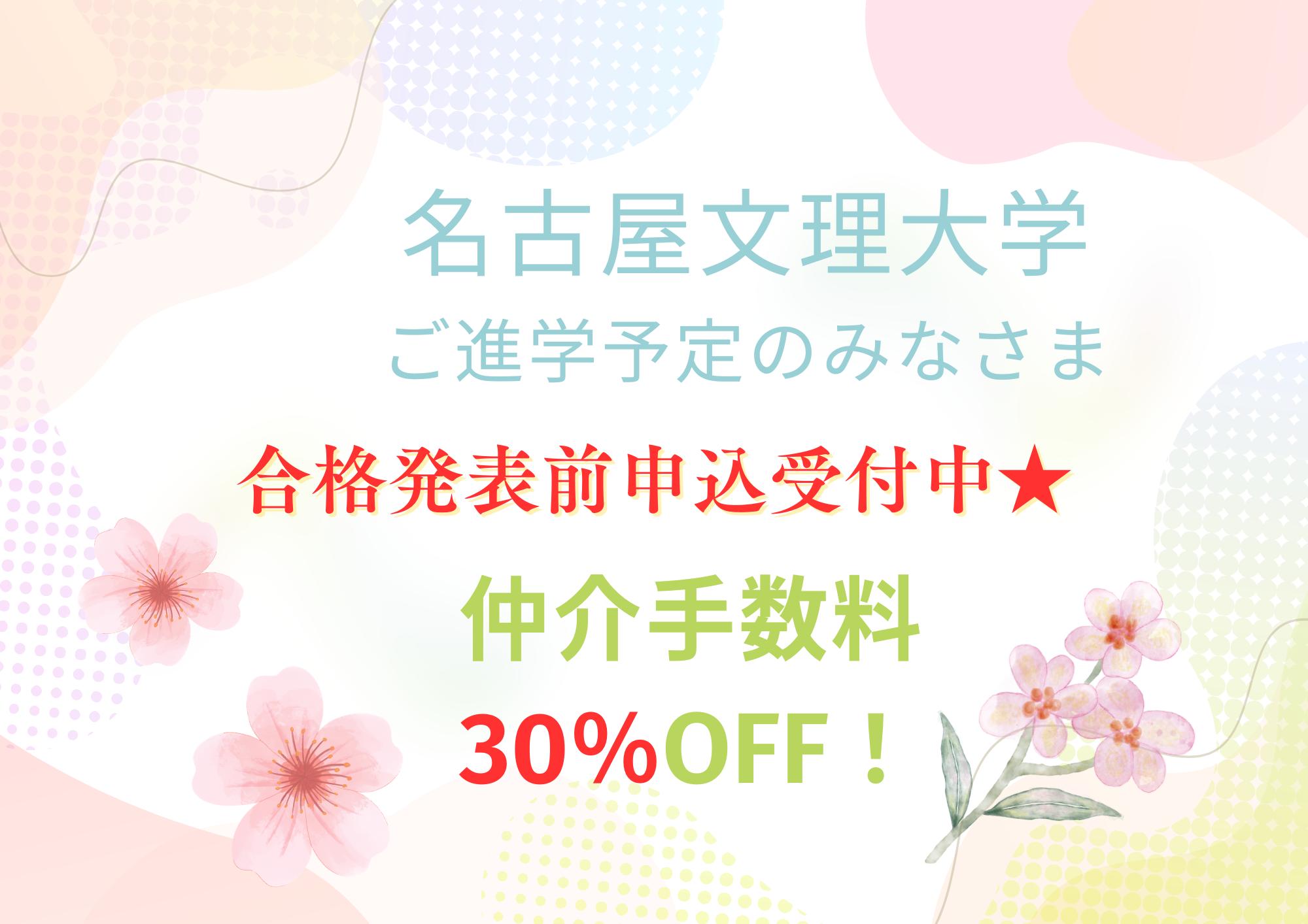 名古屋文理大学にご進学の方に限り、仲介手数料が通常の金額から30%割引となります。