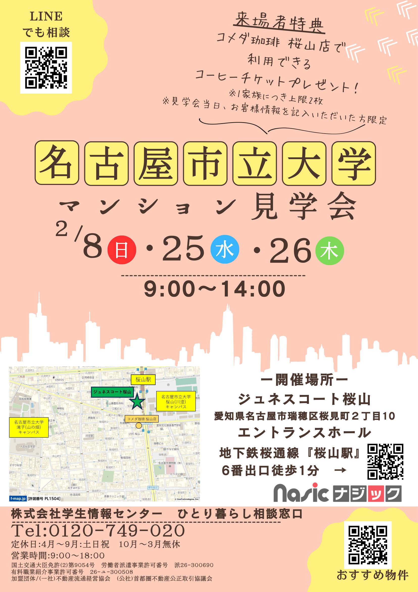 会場は、名古屋市立大学の目の前、地下鉄桜山駅からすぐの「ジュネスコート桜山」です。