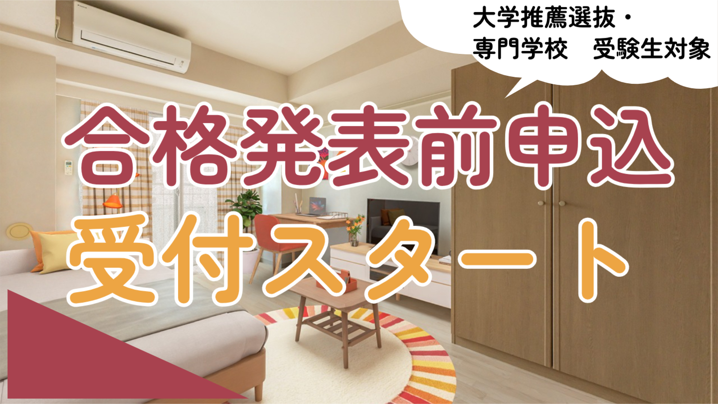 合格発表前申込は事前に希望のお部屋を申込(取り置き)いただくことにより、合格発表を確認した後スムーズにお部屋の契約ができるというサービスです。